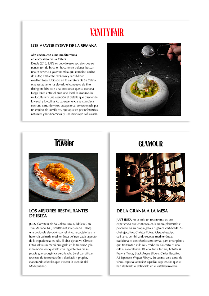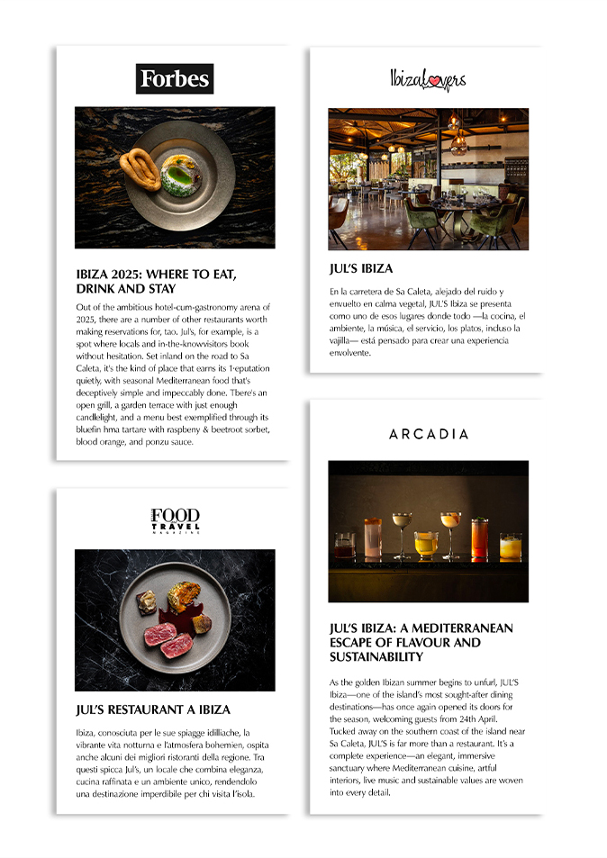 INAUGURATED IN 2018, JUL’S IBIZA IS OUR PILOT RESTAURANT. RESOLUTELY ANTI-CONFORMIST, THIS MULTIFACETED LIVING SPACE HAS BEEN IMAGINED WITH REFINEMENT AND PURITY FROM ORGANIC MATERIALS TO ANCHOR JUL’S DNA AROUND THESE VALUES OF AUTHENTICITY.